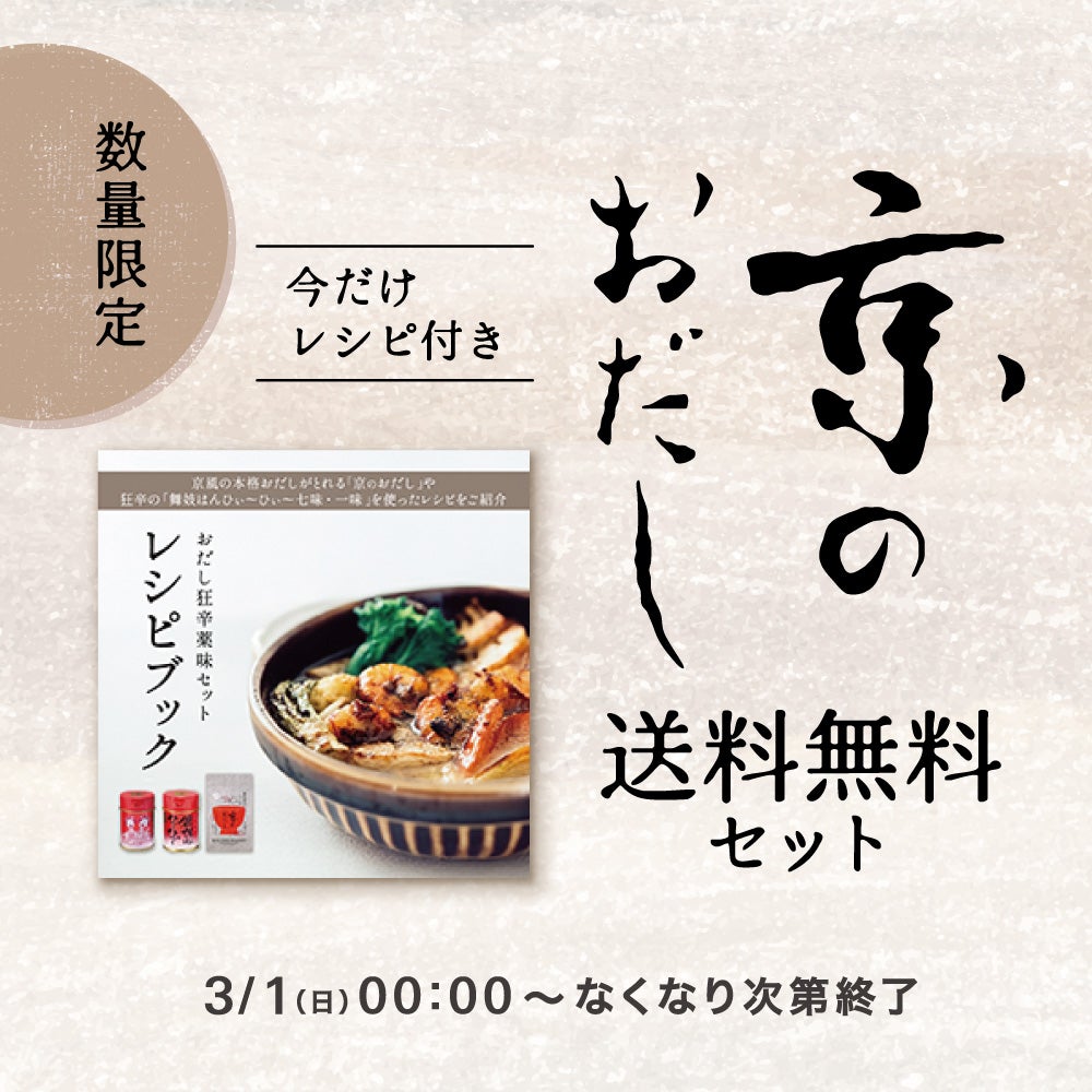 基本の調味料セットは、はじめてのお客様におススメです。京風の本格おだしがとれる、『京のおだし』に、国産柚子の爽やかな香りとみずみずしい甘みの『京の柚子七味』、国産の本鷹唐辛子を香ばしく焙煎して風味豊かに仕上げた『京の黒七味』をセット。送料無料のお試しセットです。