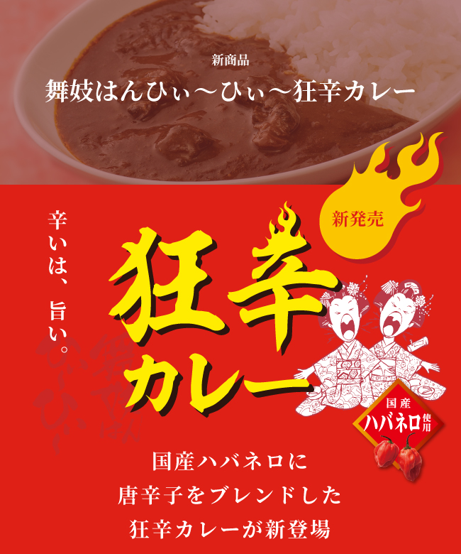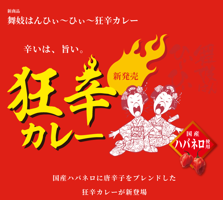 中でも狂烈に辛い「舞妓はんひぃ~ひぃ~一味」を、野菜や果実の甘い旨みがとろけるポークカレーの隠し味に選び、ガツンとにんにくを利かせました。